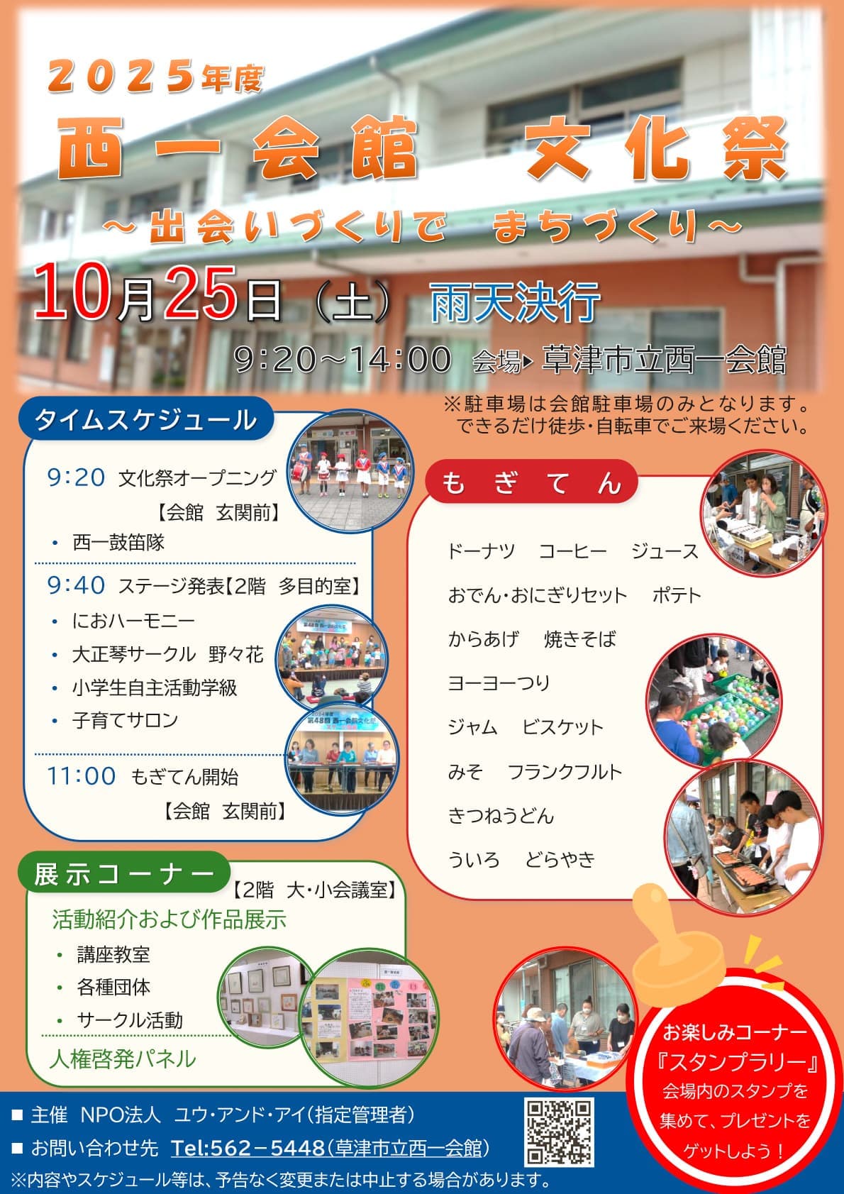 福祉の向上、人権啓発、住民交流の拠点となる隣保館として生まれた草津市立西一会館・草津市立西一教育集会所(にしいち会館)。西一地区だけでなく広く草津学区、そして市内全域の方々のコミュニティ活動の拠点として、様々な活動を行っています。小さなお子さまからお年寄りまでを対象にした文化教室・講座、子育て支援、高齢者福祉、教育支援、各種相談窓口、人権学習講座、施設開放・貸館事業…など、地域の総合コミュニティセンターとして草津市民が気軽に利用できる会館です。