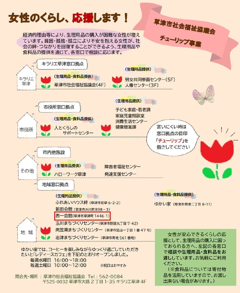 貧困・孤立・孤独により不安を抱える女性が、社会の絆・つながりを回復できるよう、生理用品や食料品等の提供を通じて、各種サービスや地域の支援につなげるなど寄り添った支援を行うことを目的にしています。