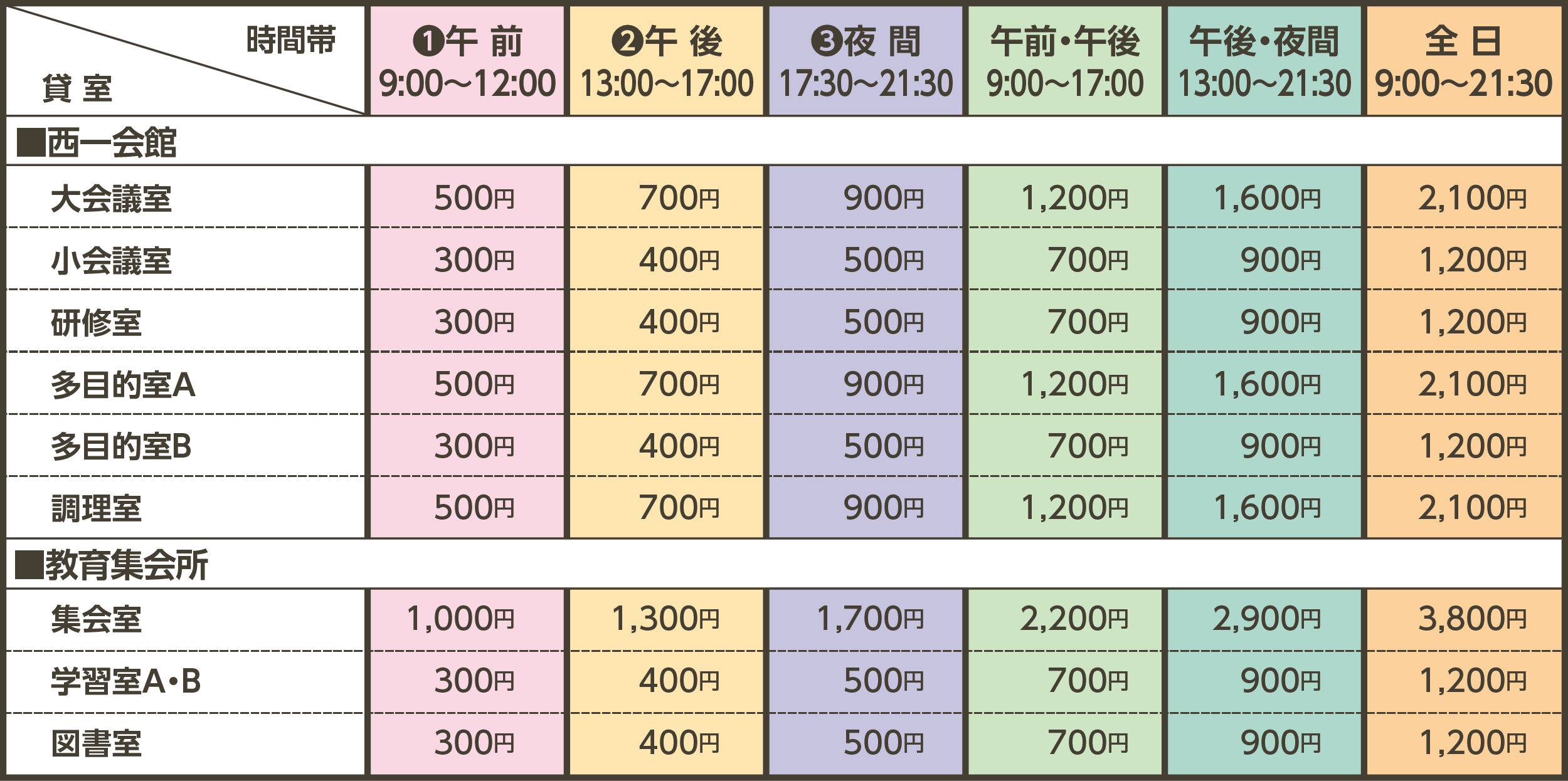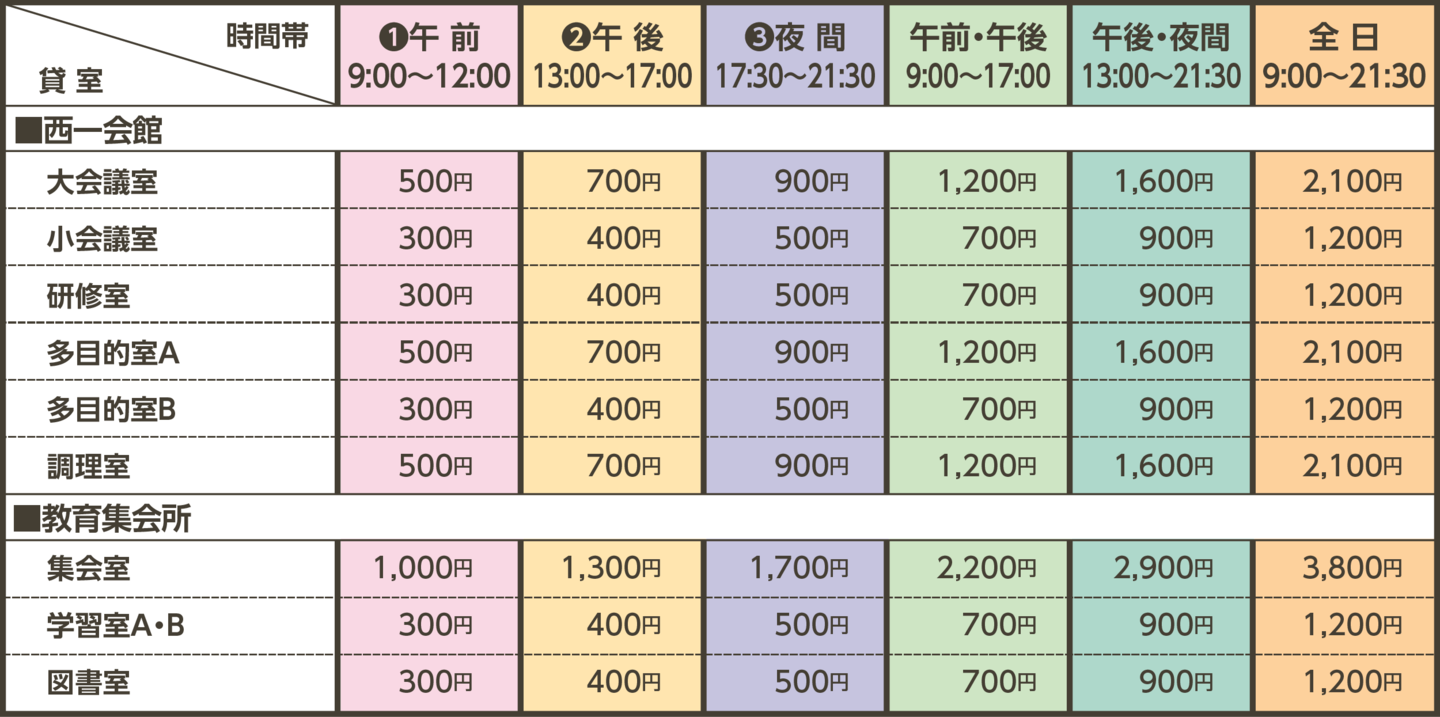 平 日 9:00〜21:30 (貸し区分:❶9:00~12:00 ❷13:00~17:00 ❸17:30〜21:30)