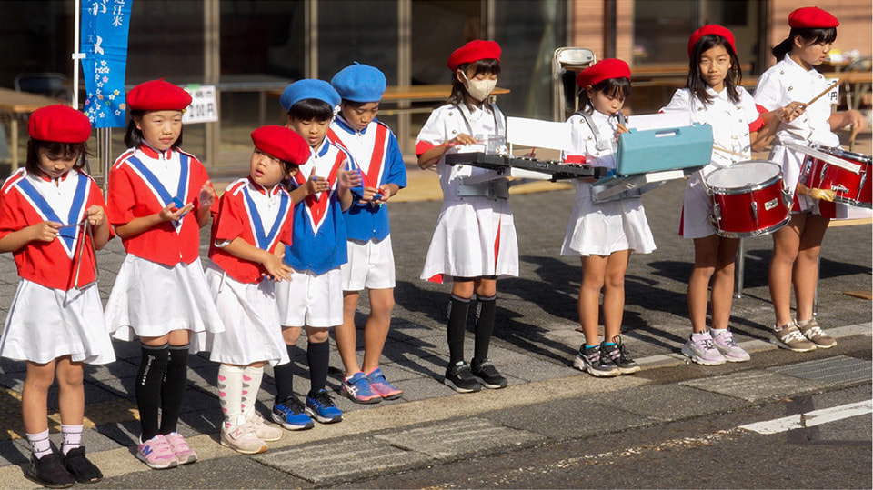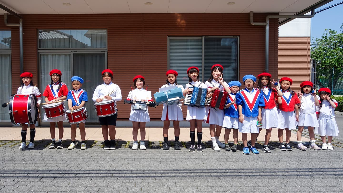 草津小学校区の子どもたちで鼓笛隊を結成しています。毎年5月3日の地守神社祭や秋の会館文化祭で発表しています。低学年から中学生までが参加して、みんなで一つの音色を紡ぎ出せるよう練習しています。楽器演奏することで表現力を養うこともできます。